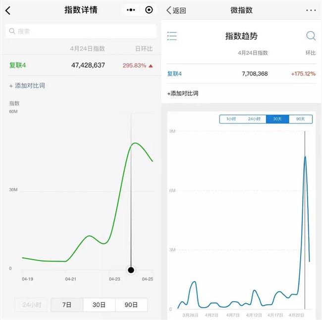 漫威迷的终章狂欢: 7 天 106 篇 10 万+,单个微博话题阅读超 33 亿 从# 300 万人零点场看首映#、#复联 4 彩蛋#到#复联 6 个人一起战斗镜头#,近几天各种复联相关话题轮番上热搜。 据榜妹手动不完全统计,自 3 月 29 日定档至今,至少有近 70 多个相关话题登上微博热搜榜,名副其实的“屠榜杀手”。其中,仅#复仇者联盟4:终局之战#话题阅读量超33. 9 亿。 上映当天( 4 月 24 日),“复联4”微信指数高达 4743 万,微指数也超过 770 万,挂在首页的推荐热词中。