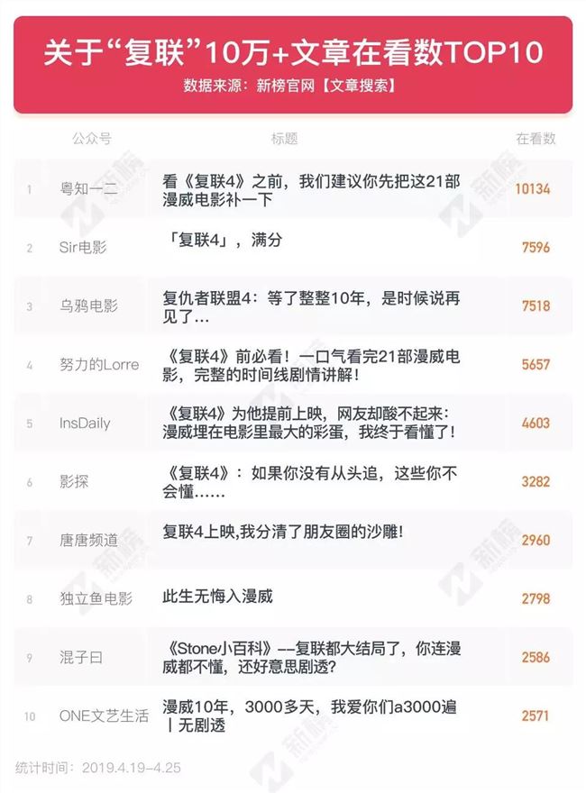 据新榜文章搜索功能显示,近 7 天内有超过1. 6 万篇微信文章提及“复联”,其中 106 篇阅读达 10 万+。 剔除掉关联性不强的蹭热点推文,我们筛选出与这部电影相关的“在看数TOP10”文章: