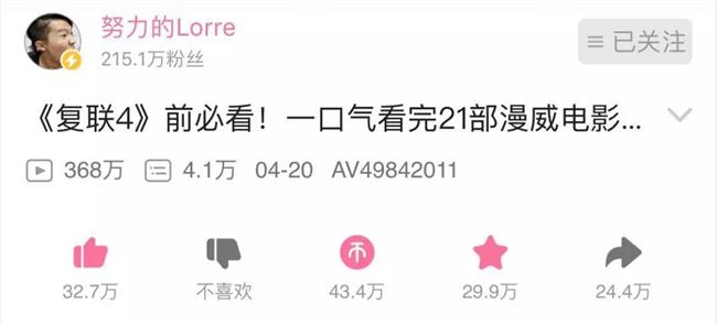 《复联4》的上映就像是一场大考,漫威迷要赶在公映前紧张地复习之前的电影,不少文章也主动为大家划起重点。 「努力的Lorre」发文《<复联4>前必看!一口气看完 21 部漫威电影,完整的时间线剧情讲解!》,他整理了上万字解说稿,视频长达 37 分钟,涵盖所有人物关系和剧情线,号称“即便是没看过一部漫威电影,也能在大银幕前享受到和影迷一样的观影体验。”